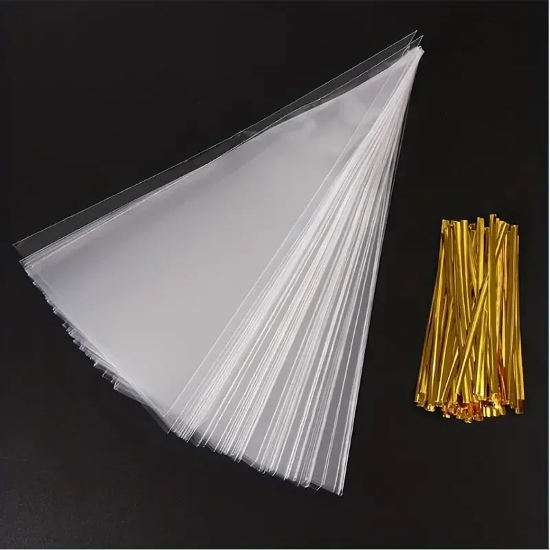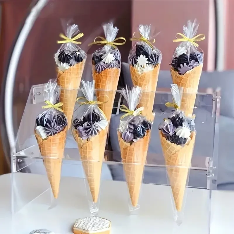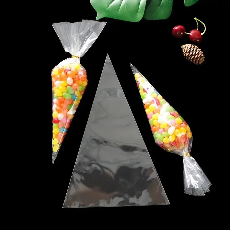 9.8x5 Inch Gift Cone Shaped Cello Treat Bags, Polypropylene Cello Bags are a food-safe material, Special Occasions, Wedding, Special Occasionss Table Gifts, Engagement, Birthday, Anniversary Parties, Suitable for Packaging Various Edibles While Preserving fFeshness Due to Their Moisture-Resistant Properties. Various Sizes,