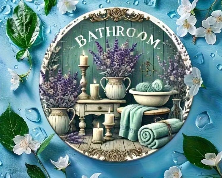 2D Flat Rustic Lavender and Candle Wooden BATHROOM Round Door Sign Design,, Farmhouse Wall Art, Creative Gift, Easy to Hang 8 Inch Diameter
