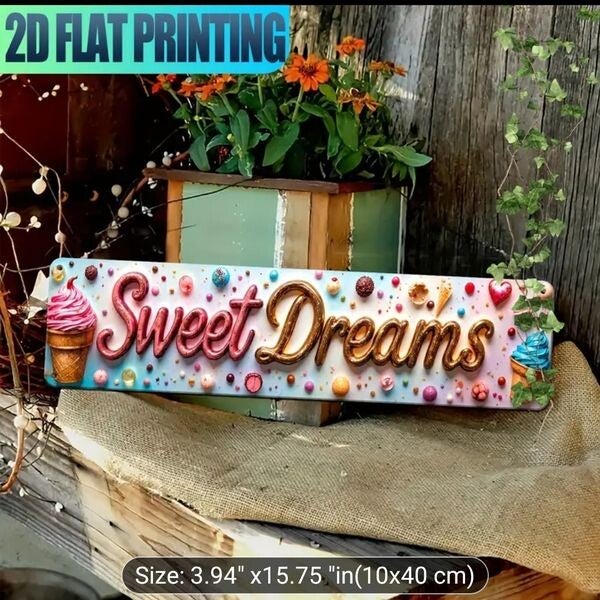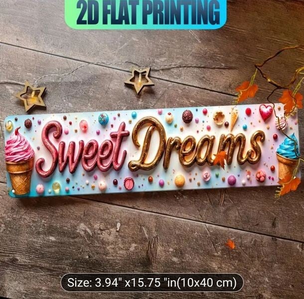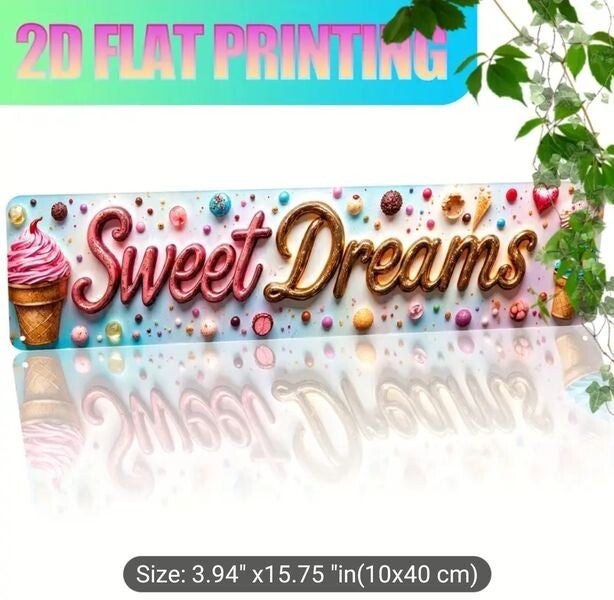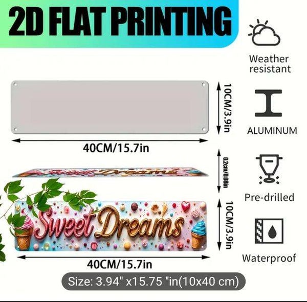 2D Flat Print, "Sweet Dreams" Dessert Design. Aluminium Wall Door Sign UV Printing, Multi-Purpose, Indoor Durable & Easy to Hang Decor, Size 4x15.5 Inch Rectangle,