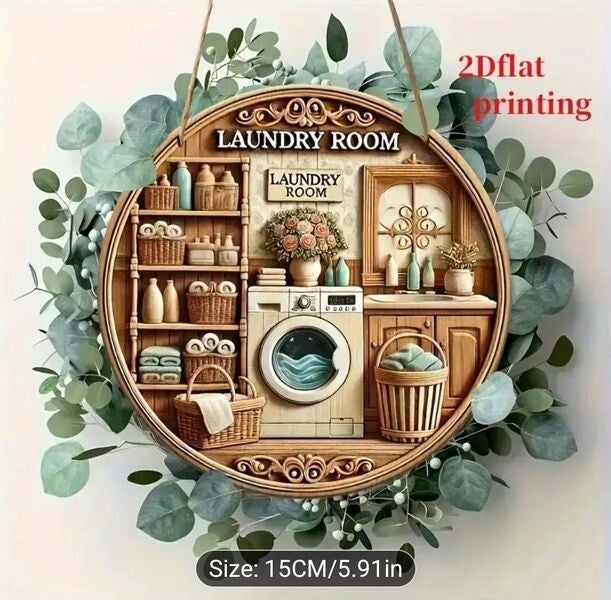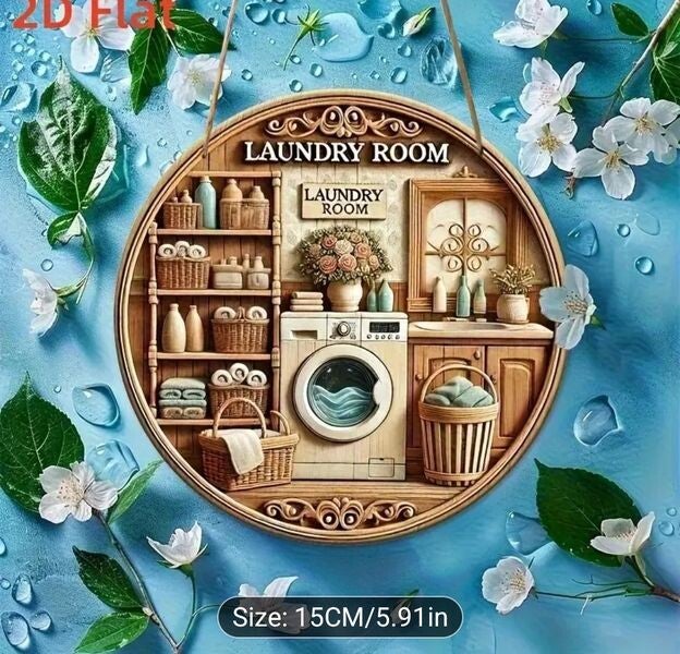 LAUNDRY ROOM Wooden Door Wall Plaque Sign, Home Washing Machine Room, Hanging Sign, Simple to Fit, Pre Drilled Holes For Hanging, Kitchen , Launderette, Washroom, Washing, Arts and Crafts Plaques, 8 Inch Diameter