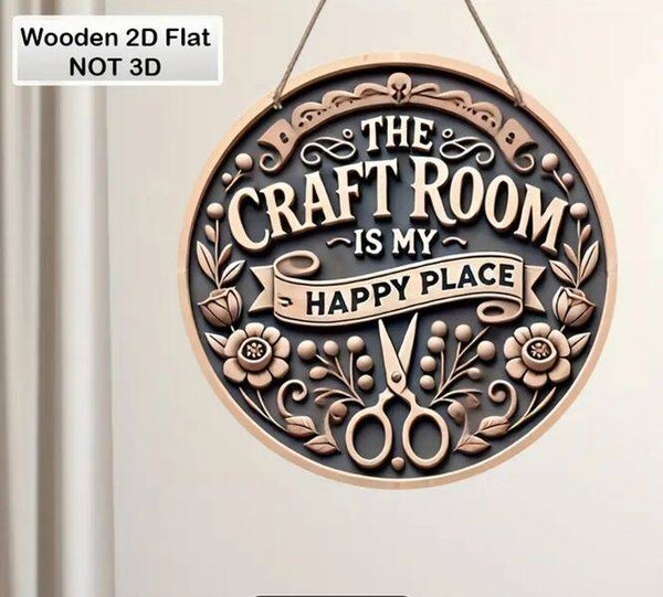 Wooden THE CRAFT ROOM "The Craft Room Is My Happy Place" Worded Round 8 Inch Diameter Sign Easily Fitted Wall Door Mounted, Lightweight, Perfect for Craft Room DIY Projects, 2D Flat Print, Pre Drilled Holes,
